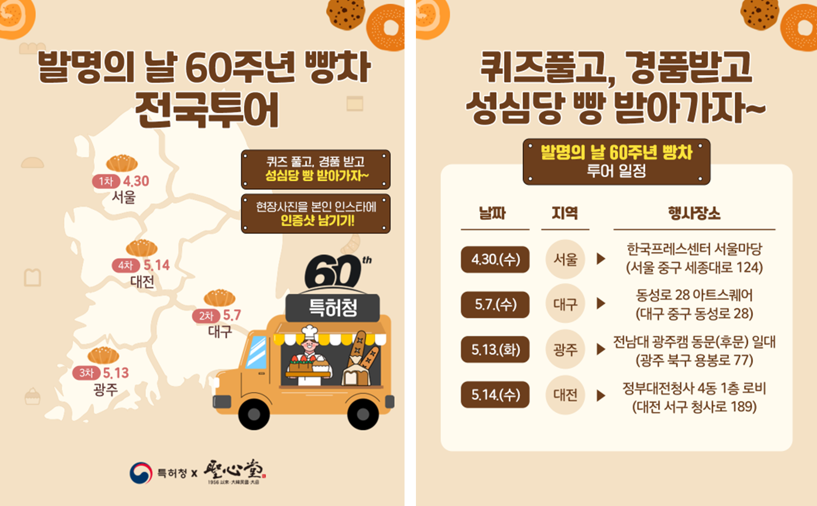 성심당 빵차는 전국 주요 도시를 순회하며, 방문객들에게 무료로 빵을 나누어주고, 발명관련 퀴즈 이벤트도 함께 진행합니다.